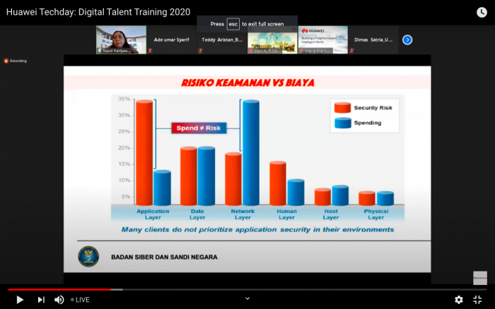 Hal itu disampaikan Nunil di acara “Huawei Tech Day: Digital Talent Training 2020”, Kamis (24 September 2020). Nunil menyebutkan setidaknya ada tujuh hal yang perlu menjadi perhatian tiap-tiap organisasi terkait keamanan siber, antara lain application layer, data layer, network layer, human layer, host layer, dan physical layer.