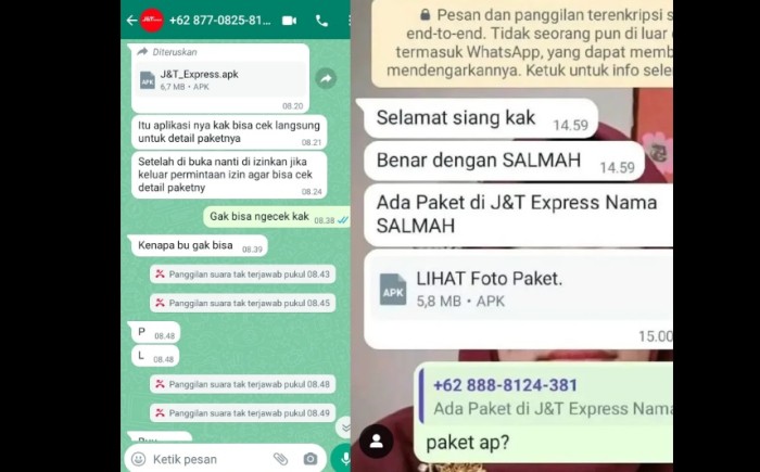 Sejak akhir November lalu, ramai di media sosial terkait penipuan online berkedok kurir J&T Express. Sang kurir mengirim sebuah file cek resi paket. Hanya saja, bentuk file tersebut bukan .pdf atau .jpeg, tapi berbentuk .apk.
