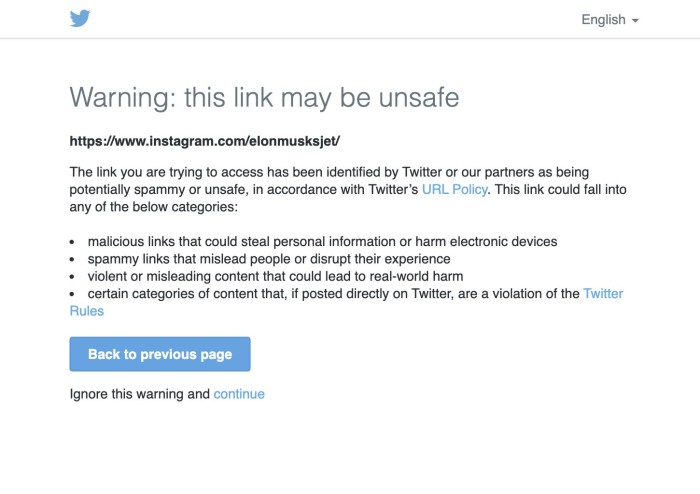 Mencoba men-tweet tautan tertentu ke pelacak jet Elon Musk Sweeney di platform lain akan menampilkan pesan bahwa tautan tersebut "berpotensi berbahaya", seperti yang terlihat oleh Tony Webster.
