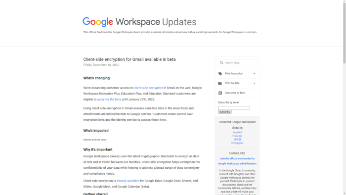 Google mengumumkan enkripsi end-to-end untuk Gmail (E2EE), dengan beta enkripsi sisi klien Gmail, pengguna dapat mengirim dan menerima email terenkripsi di dalam domain mereka dan di luar domain mereka.