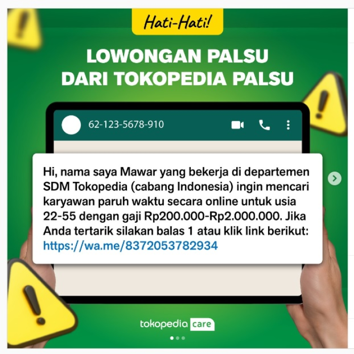 "Hati-hati apabila menerima link dan jangan asal klik link yang diterima melalui pesan dari perekrut yang mengatasnamakan Tokopedia. Pastikan dahulu perekrut adalah betul dari pihak Tokopedia."