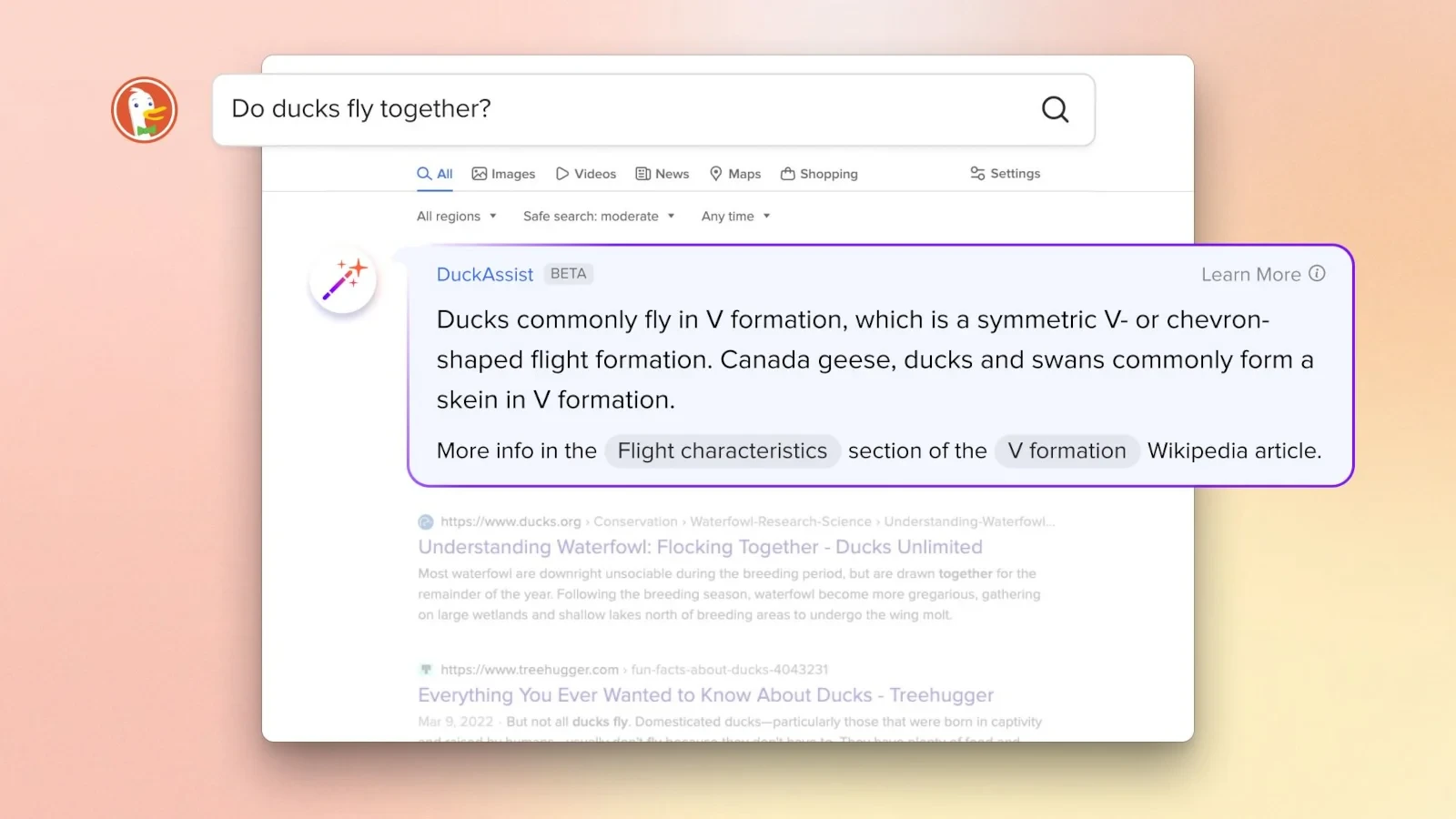 “Anda seharusnya tidak berharap untuk melihat duckassist pada banyak pencarian Anda, tetapi kombinasi AI generatif dan wikipedia di duckassist berarti kami dapat meningkatkan jumlah jawaban instan yang dapat kami berikan,” kata Duckduckgo.