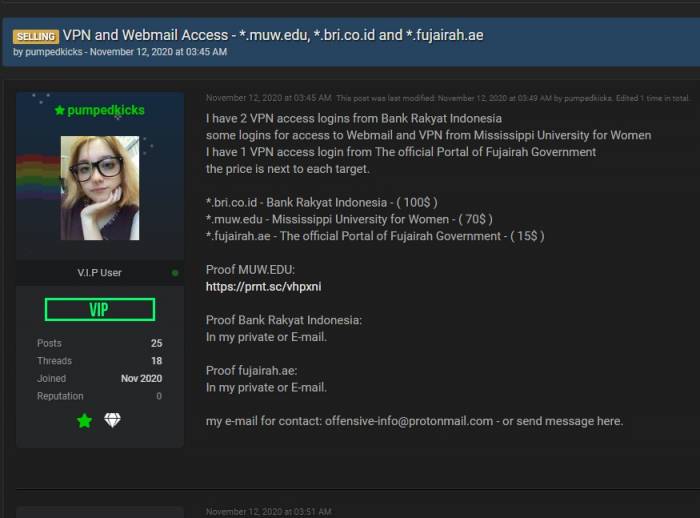 Dua akses layanan jaringan pribadi virtual (VPN) milik Bank Rakyat Indonesia (BRI) diklaim oleh peretas di forum dark web telah terjual.